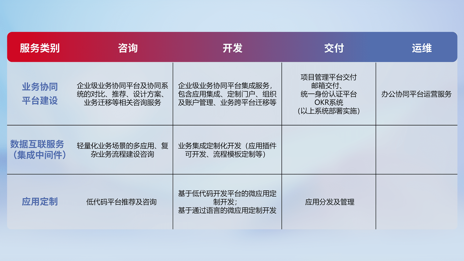针对钉钉、、、、企微、、、IDaas等平台级产品提供产品的规划、、、、方案、、、交付、、定制化开发等服务,,,,实现如统一协同办公、、、智能客户服务、、、混合会议管理、、、、智能数据查询、、、等业务场景,,,实现数字化转型。。。。